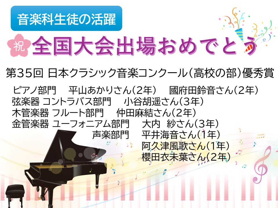 音楽科から全国へ🎹快挙!!8名🌸第35回 日本クラシック音楽コンクール 全国大会出場おめでとう