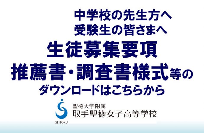 2026年度・令和8年度入試の「生徒募集要項」及び出願に必要な書類は、こちらのページにまとまっています。 ⇒ 募集要項・入試日程 | 聖徳大学附属取手聖徳女子高等学校 インターネットによるweb出願で、11月1日(土)よ … 続きを読む 2026年度生徒募集要項・出願書類一式~こちらからダウンロードできます。