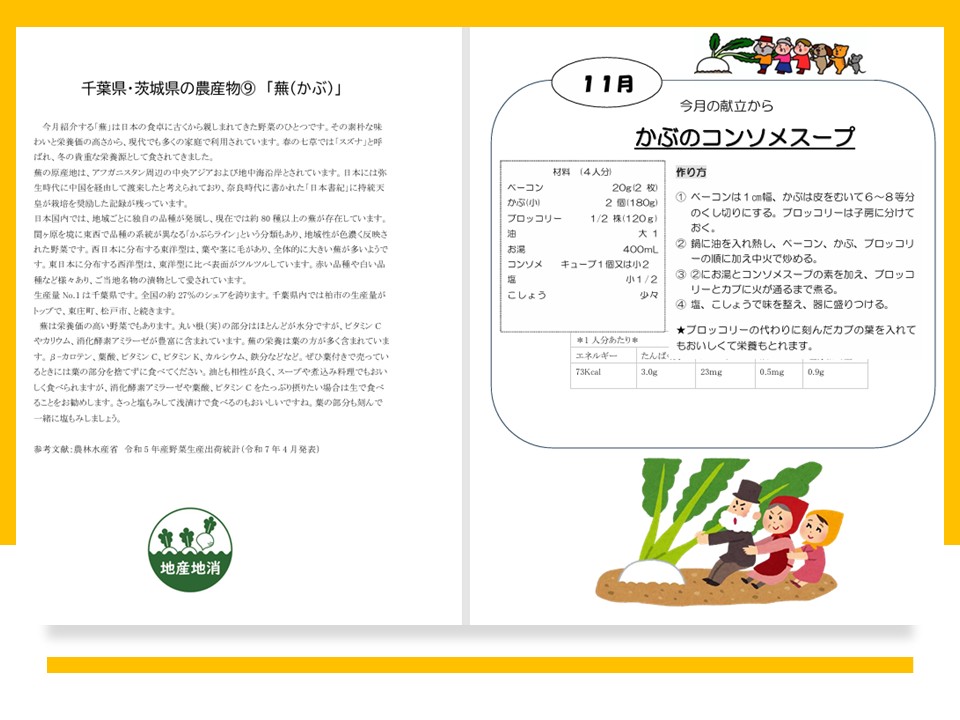 ご好評をいただいている「今月の献立から」には、「かぶのコンソメスープ」のレシピが紹介されています。「蕪(かぶ)」は、古くから親しまれてきた野菜のひとつです。素朴な味わいと栄養素の高さから、現代でも多くの家庭料理で利用されています。