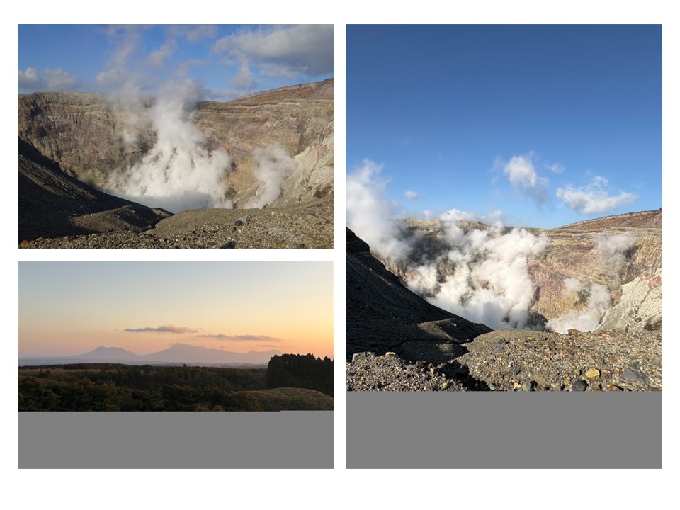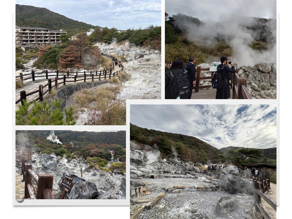 [ 第2日目 ]は雲仙の自然を感じながらのスタート!車窓から仁田峠の雄大な景色を望み、普賢岳(昭和新山)を間近に見て、自然の力強さを感じました。その後は、徒歩で「雲仙地獄めぐり」へ。