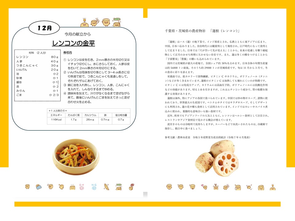 「今月の献立から」は、2日(火)のメニューにある「レンコンのきんぴら」のレシピです。ご家庭でもお試しください。
