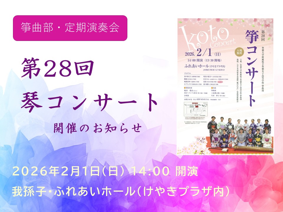 令和8年2月1日(日)、我孫子市けやきプラザ内ふれあいホールにおいて,本校箏曲部の定期演奏会[ 第28回 箏コンサート ]を開催いたします。