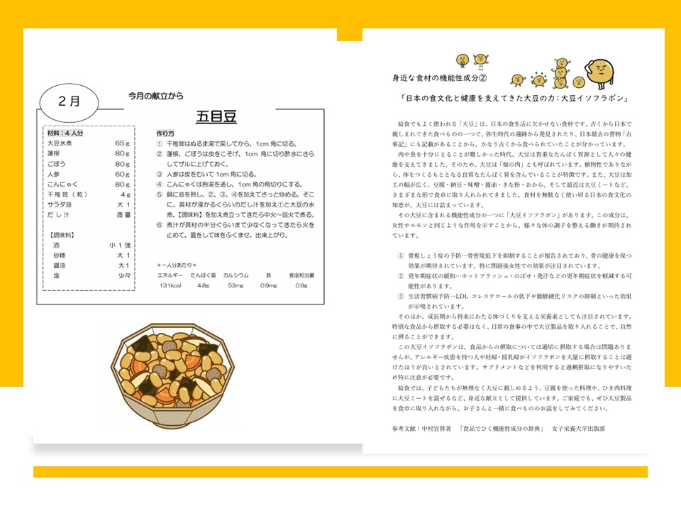 ✤ 「五目豆」「大豆イソフラボン」についてはpdf.でもご覧になれます。⇒ 今月の献立から 五目豆 身近な食材の機能性成分➁・大豆イソフラボン