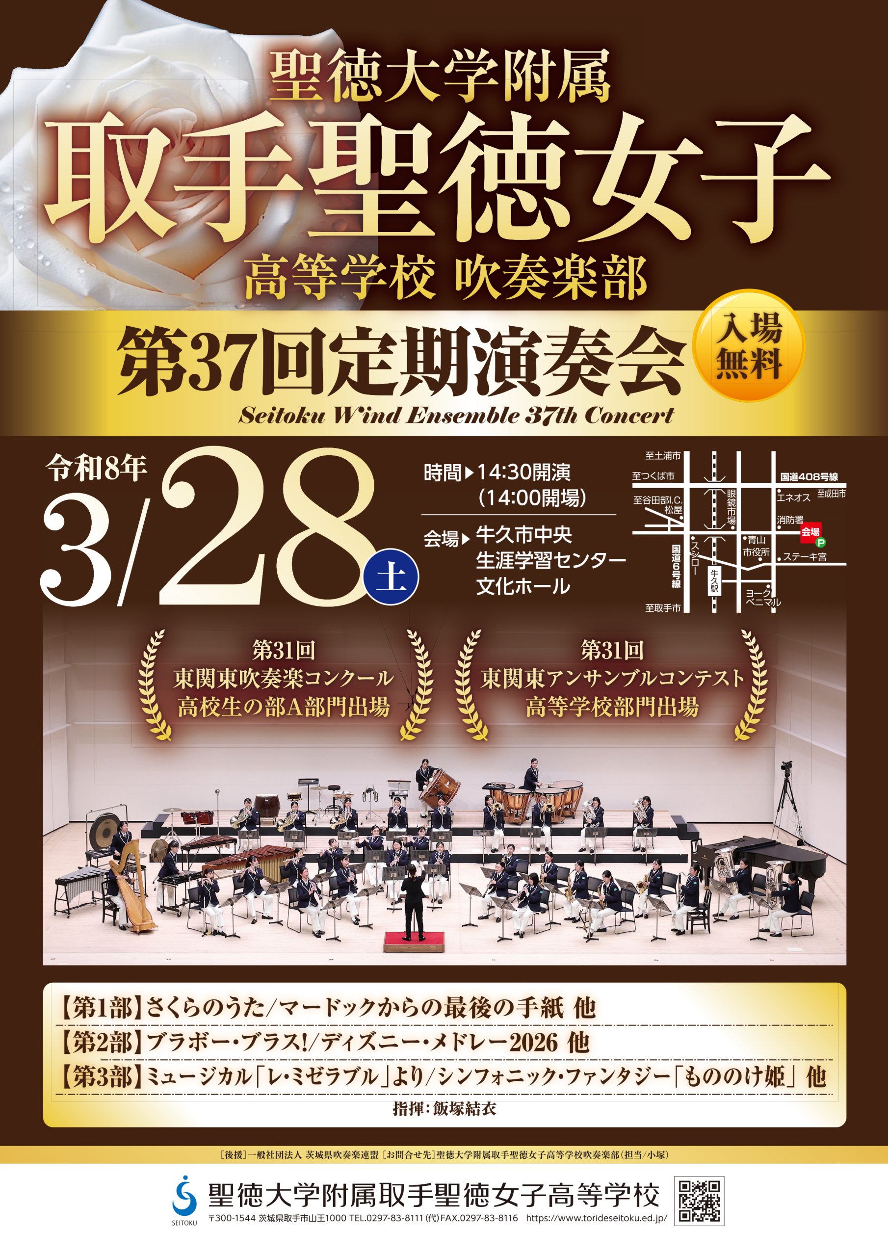 来る令和8年3月28日(土)、牛久市中央生涯学習センター文化ホールにて、[ 第37回 吹奏楽部 定期演奏会 ]を開催いたします。14:30 開演です。多くの皆さまにご来場いただけますよう、ご案内申し上げます。