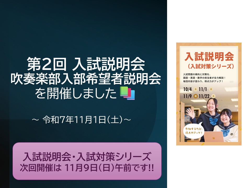 令和7年11月1日(土)、[ 第2回 入試説明会・入試対策シリーズ ]及び[ 吹奏楽部入部希望者説明会 ]を開催し、たくさんの受験生・保護者の皆さまにご来校いただきました。ご参加いただいた皆さ...
