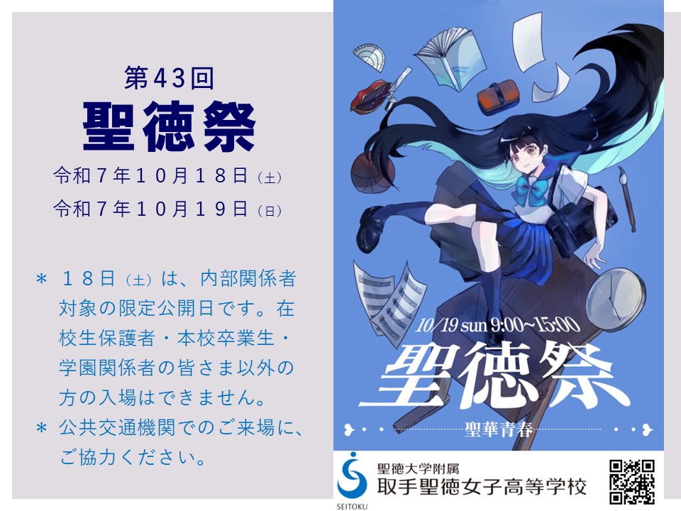 令和7年10月19日(日)9:00 ~ 15:00(8:45 受付開始)、[ 第43回 聖徳祭(文化祭) ]を開催いたします。卒業生の皆さま・保護者の皆さま・近隣の皆さま、ぜひ、生徒たちの活動の様子をご覧ください...