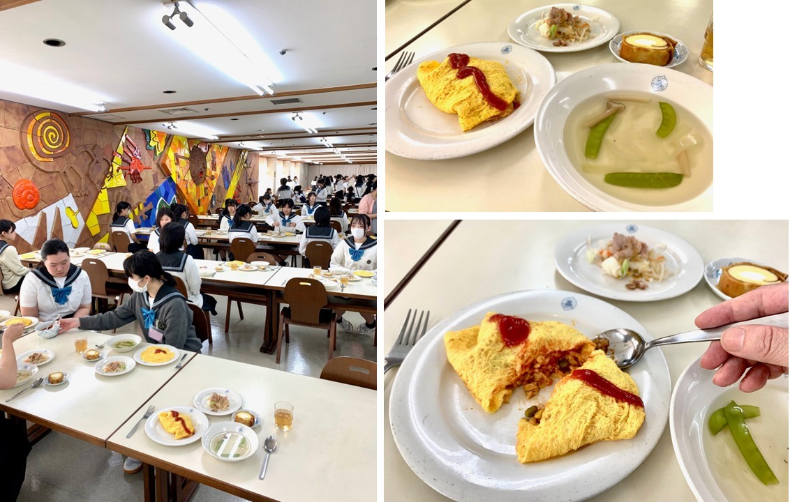 ( 2025/10/8 12:33~12:35 この日は(学校給食仕様の)オムライス、しゃぶしゃぶサラダ、コンソメスープ、ロールケーキ。 )