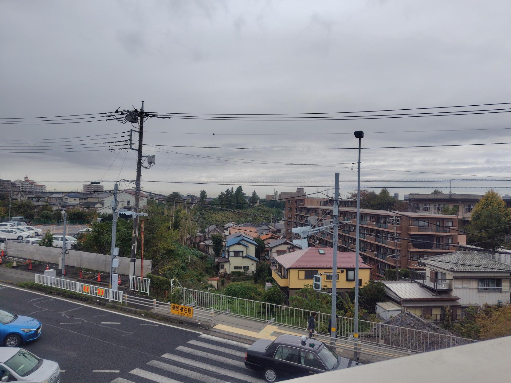 ( Oさん撮、白山前T字路歩道橋からの景。歩道の真下に民家の屋根が見え、細かく起伏のある地形のゾーンが都市化したことが見てとれます。2025/11/6 9:40頃)