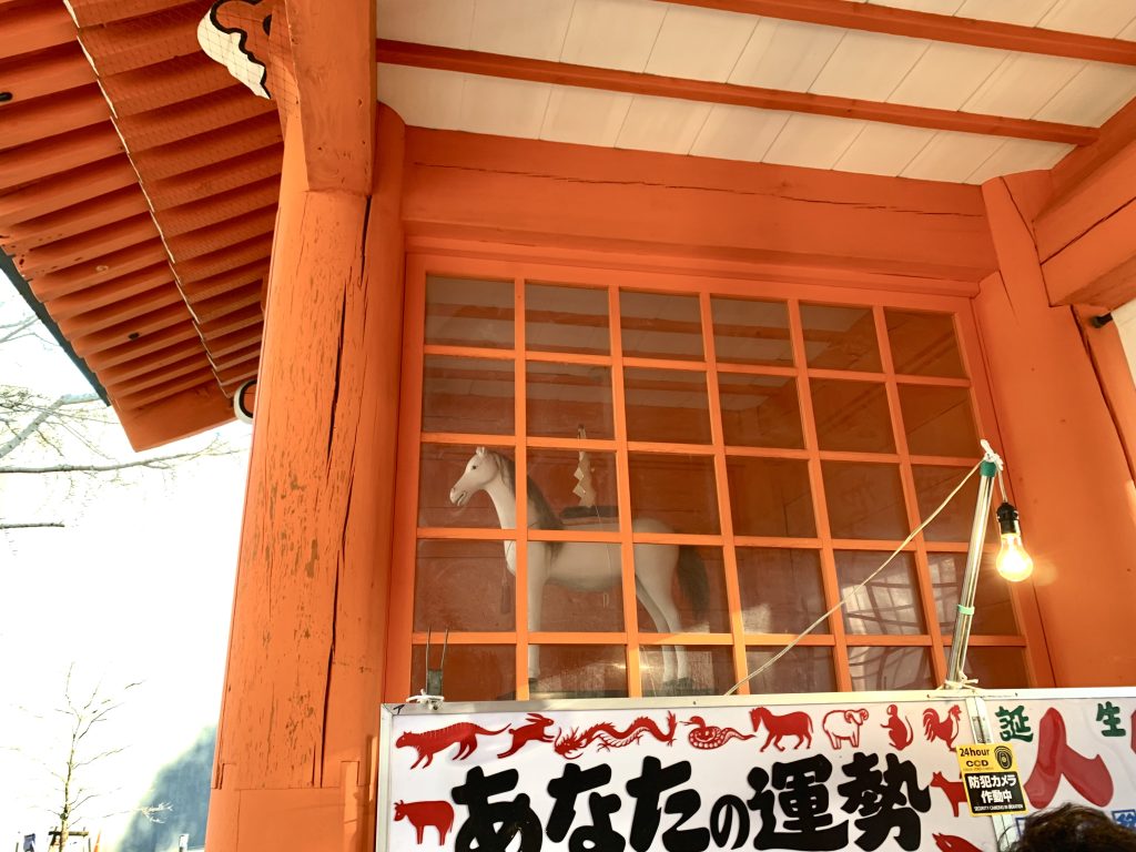最後尾に着くと、門の際には本年の干支、白馬の姿が。