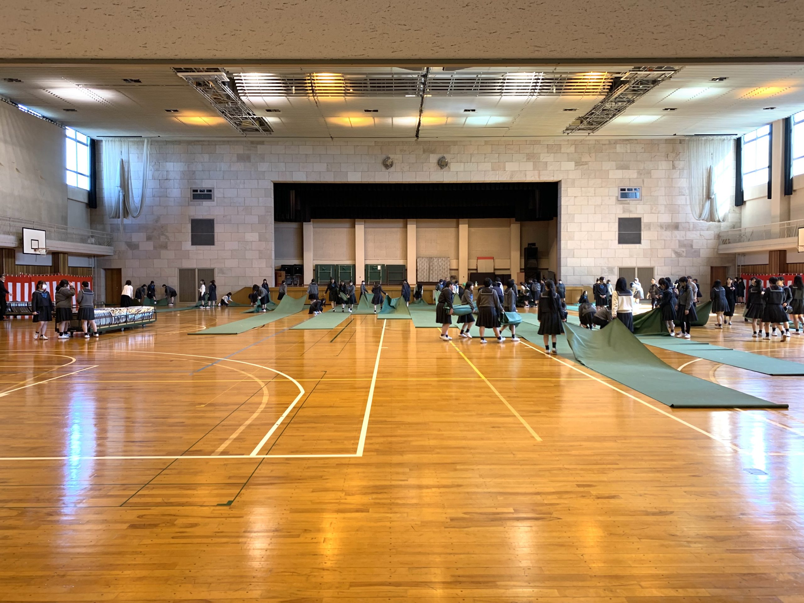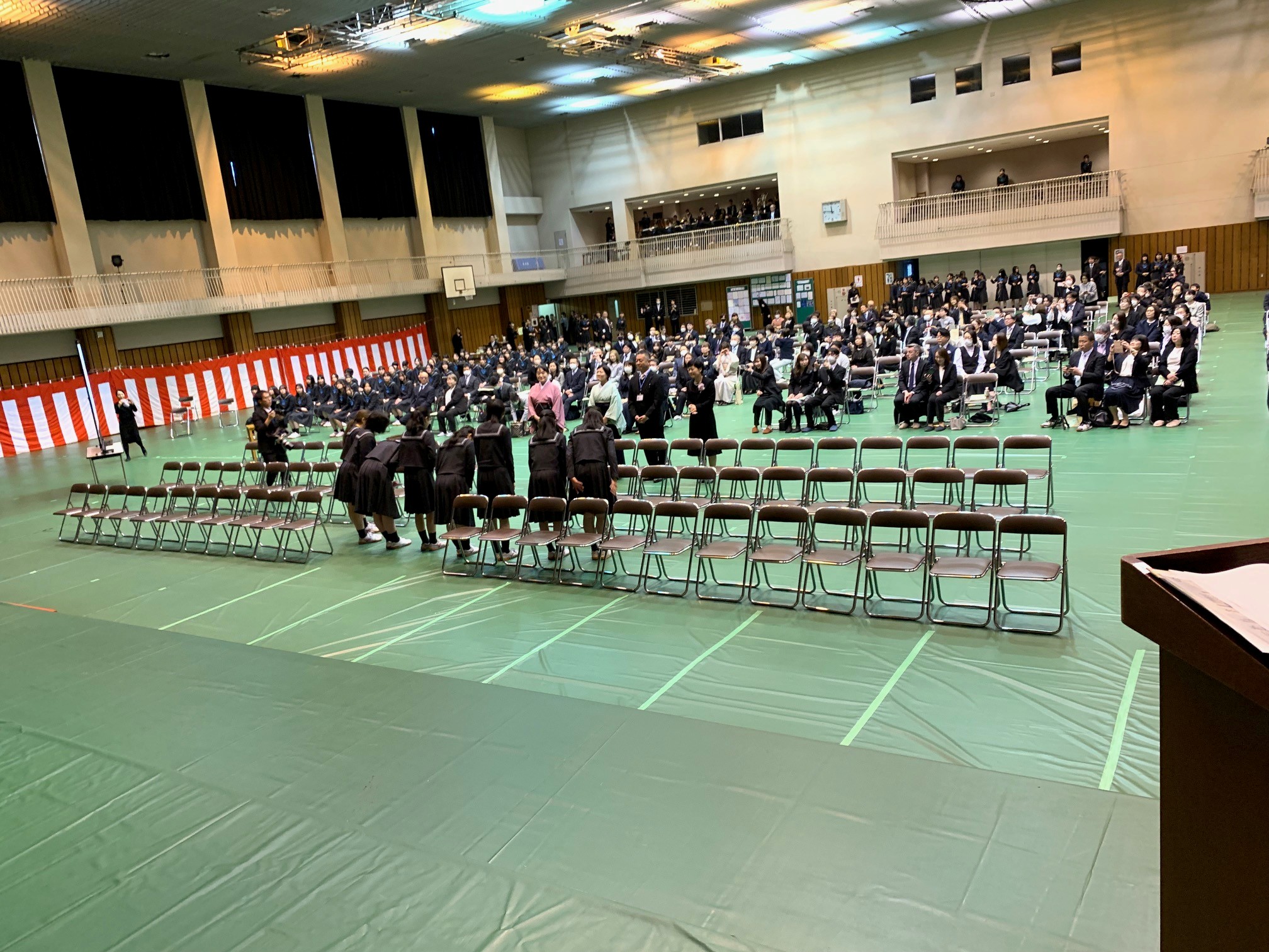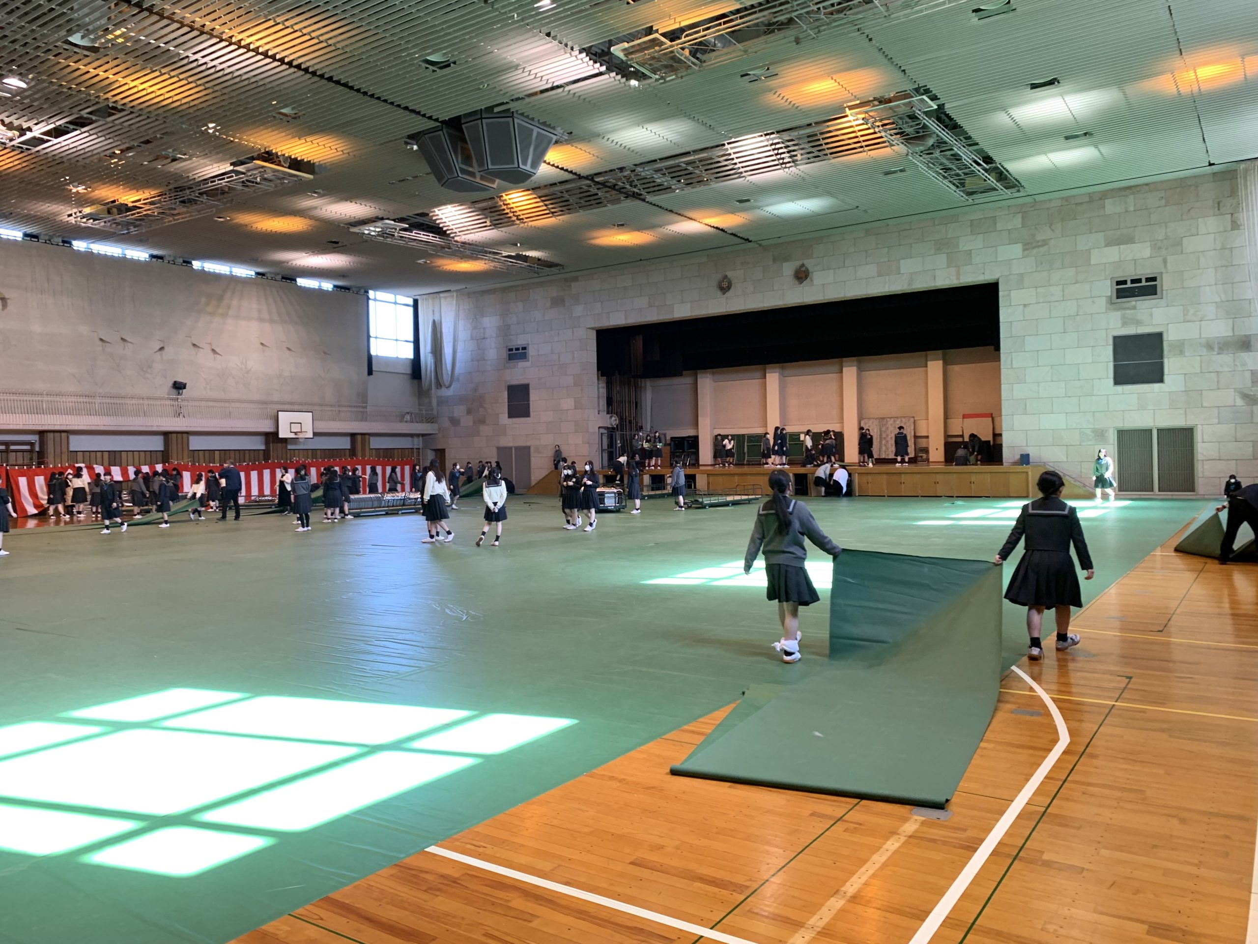 生徒玄関でお見送りのため別行動。)で式場の後片付け。